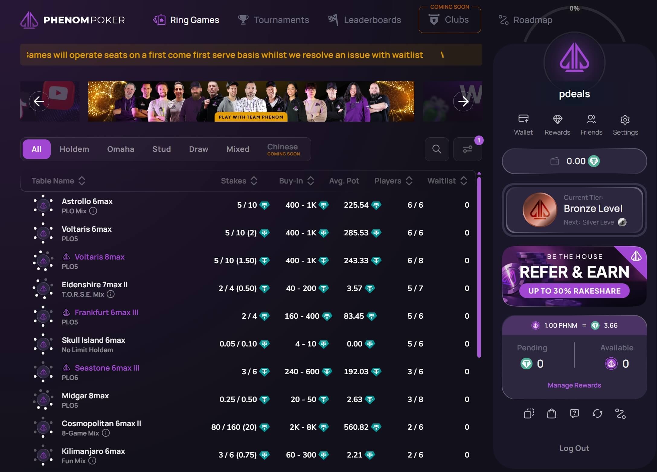 On top of that, the loyalty program goes up to 35% rakeback. Everyone starts at 15%, and the more points you earn (1 point per $1 in rake), the higher your tier climbs. Top players can reach the Phenom tier, which includes both max rakeback and discounts on merchandise.